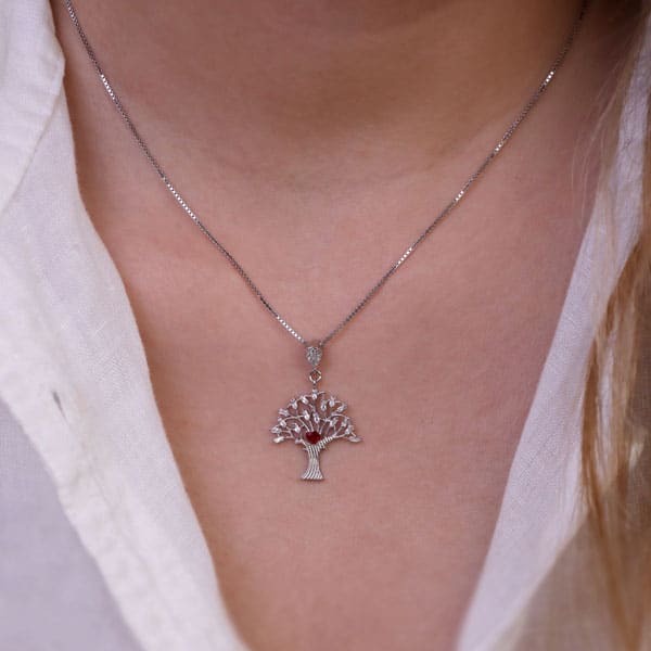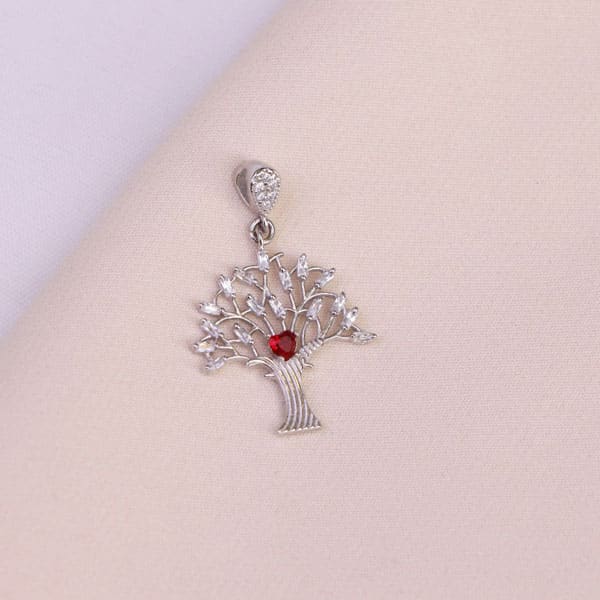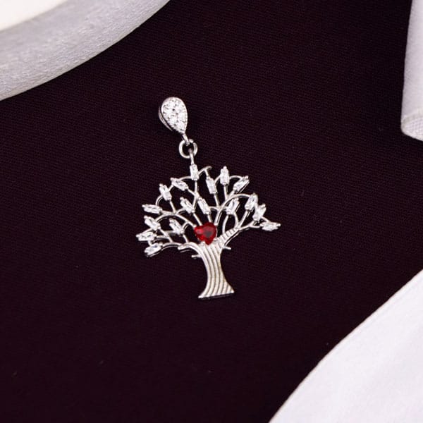 گردنبند نقره دخترانه درخت عشق کد 21912 از نگین های باگت و زیرکنیا تشکیل شده است. در میان نگین های زیبا و درخشان تک نگین یاقوت سرخ کار شده است که زیبایی این گردنبند نقره را دوچندان میکند. تمامی محصولات نقره دریتا از نقره عیار 925 تشکیل شده به همره آبکاری طلاسفید برای دوام و کیفیت و درخشش بیشتر محصولات.کيفيت زيورآلات در فروشگاه دريتا: